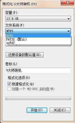 3、在文件系统中选择NTFS格式,然后点击“开始”,进行格式化