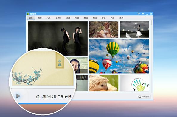 360壁纸是奇虎360旗下研发的一款桌面高清壁纸美化产品。360壁纸为用户提供了风景、美女、小清新、爱情等十几种不同分类的海量高清壁纸,支持壁纸自动更换,一键收藏等众多个性化定制功能。360壁纸软件支持一键设置、定时自动更换桌面壁纸的软件。360壁纸提供了包括风景、美女、小清新等十多类高清壁纸,可以自动匹配电脑分辨率,实现一键更换。同时支持定时自动更换壁纸的功能,让电脑桌面告别单调,让超美壁纸与你不期而遇。