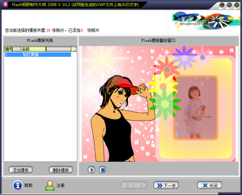Flash相册制作大师让您将喜爱的照片在一分钟之内转换成精彩的Flash动画。整个过程操作简单,只要选择好我们给您提供的模板,添加您的照片即可导出SWF文件。您完全不用懂得烦琐的Flash制作和照片的处理过程,一切由我们的软件帮您轻松解决。