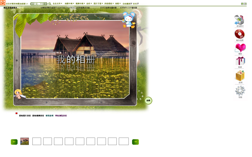(12)可设置每个主题的封面封底、前景动画、个性相框可生成VCD/SVCD/DVD/MPG/AVI(MPEG-4)格式视频文件。