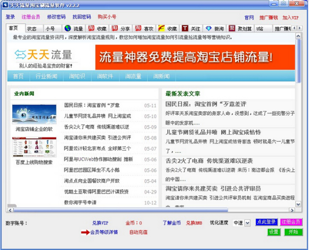 天天流量是一款专门用于淘宝辅助的专业工具,能够帮助淘宝掌柜提升店铺的流量、收藏、喜欢、分享等等多个功能。软件用户可以通过天天流量提供的淘宝互动平台注册会员进行互相收藏、互踩流量、互相喜欢等操作,来提升店铺总流量和宝贝收藏数量,从而达到店铺的总盈利的上升。且在淘宝互动平台上,由于是大家作业,IP都是全国各地的,保证了安全和有效性。天天流量软件是提升淘宝收藏量、提升淘宝流量、提升淘宝人气以及提升淘宝喜欢的好软件,是开淘宝店铺掌柜的好助手!
