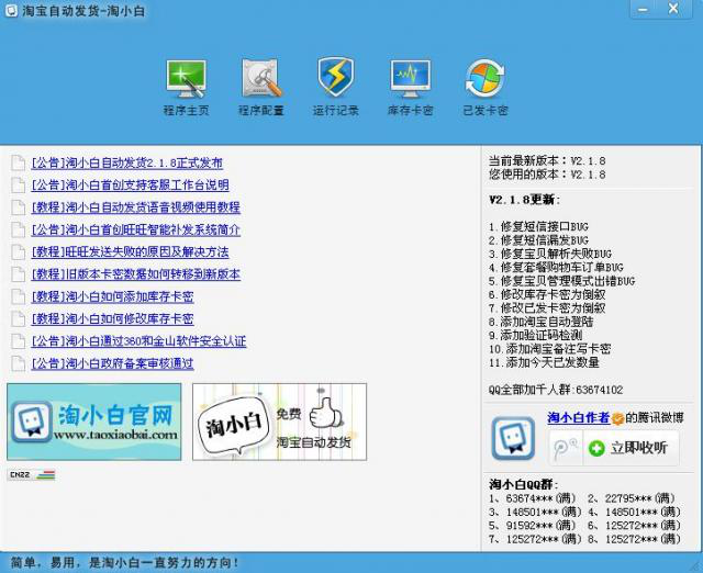 淘小白是一款适用在淘宝上的淘宝全自动发货软件,本软件永久免费,真正实现全天无人管理经营网点。店长不用每天在为发货问题发愁,可以安心的将电脑打开,去做自己想做的事,淘小白会帮你打理店铺里的一切。
