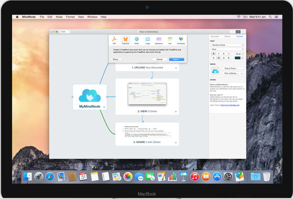 MindNode支持云端同步和数据导出,并且可以通过 iCloud来同步内容,可以通过iPad、iPhone 随时随地记录一闪而过的想法和灵感。MindNode 还支持 AppleWatch 查看脑图和任务。你也可以回到苹果 Mac 电脑上用 MindNode for Mac 版则对脑图做进一步更细致的处理和完善,更高效率地整理文档。你也可以将你制作的脑图可以通过 iCloud 分享给其他苹果用户,支持 Dropbox 传输,也可以导出成 PDF 文档、PNG 或是 TIFF 等格式的图片、TXT 纯文本等格式分享给任何人。