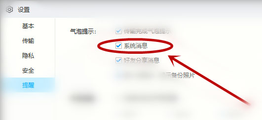 5、在右边窗口,选择【气泡提示】选项组中的【系统消息】选项。该选项默认是勾选打开的