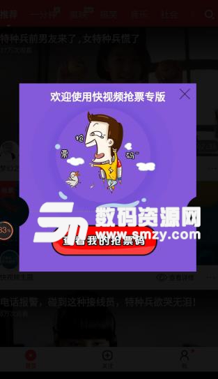使用手机浏览器扫描二维码下载抢票专版。下载完成后打开快视频软件,首次开启后会出现查找抢票码提示,点击“查看我的抢票码。务必注意页面提示的使用时间。拿到后一定要快速输入电脑。