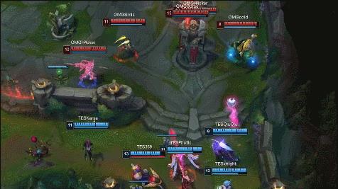 比赛中可以多次看到TES战队抱团消耗防御塔的局面,TES在中期之后就一直在避战,然后灵活地转线来形成对防御塔的攻势,在推塔之前先POKE,同时抓机会打下路组合的控制链先手配合炸弹人大招抓先手减员的机会。