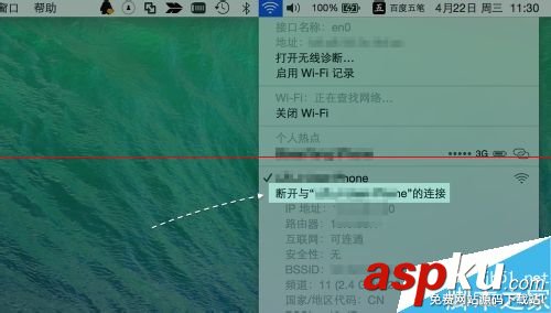 3、接着我们再点击 Mac 顶部的无线网络菜单,可以看到会在当前接入无线下文多出了一个“断开”的选项。当然除了可以看到有断开选项以外,还可以看到当前连接无线的一些详细的无线参数。
