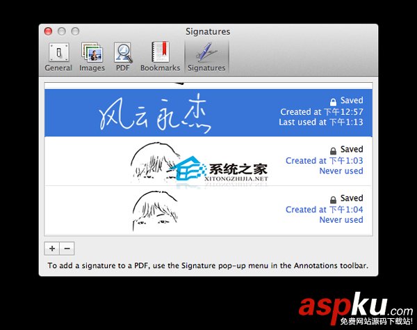 5. 使用你的签名;打开你需要使用签名的PDF文件,然后点击工具栏的Annotate按钮,然后选择Signature按钮右则的下拉箭头,在弹出列表里面选择你的签名!然后在放到你需要签名的地方!