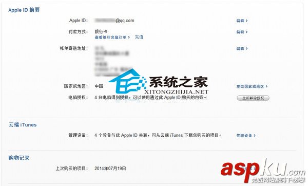 左上角有登陆摁钮,你需要先等你的 Apple ID,如果是你自己的设备已经默认显示你的Apple ID,只需要输入密码即可以登陆。登陆之后,同样的位置点击你的Apple ID,会有四个下拉分别是:账户、兑换、我的预购清单和推出,点击“账户”进入个人账户中心,你会看到下图所示内容: