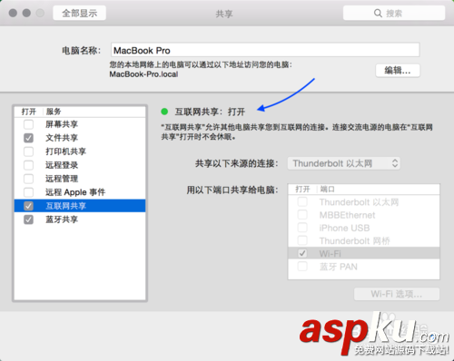 注:如果你的Mac是用有线拨号上网的话,请选择PPOE作为共享源。