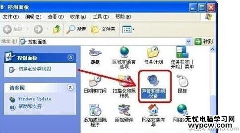 进入到电脑的控制面板中后找到相关的声音和音频设备,点击下图所示的图标进入到相关的功能界面中,进行声音设置。