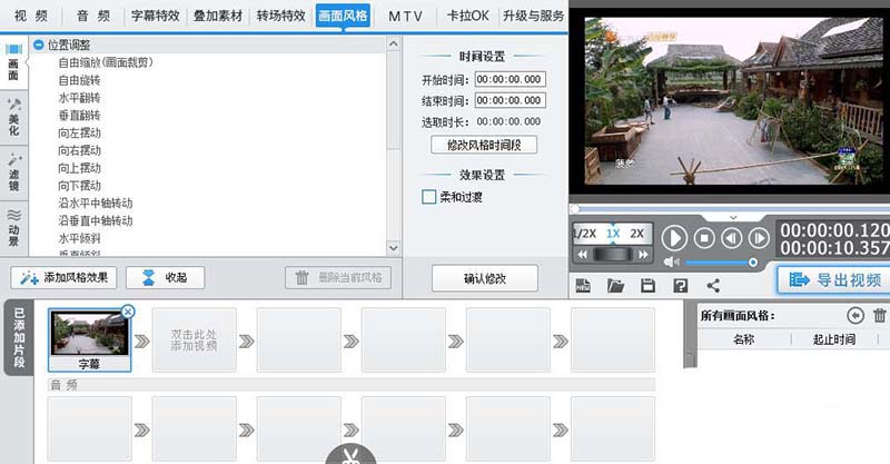 6、在右下角的所有画面风格栏,可以看到添加的画面风格;选中画面风格,在时间设置栏可以调整风格开始和结束的时间;在效果设置栏还可以该调整风格的效果。