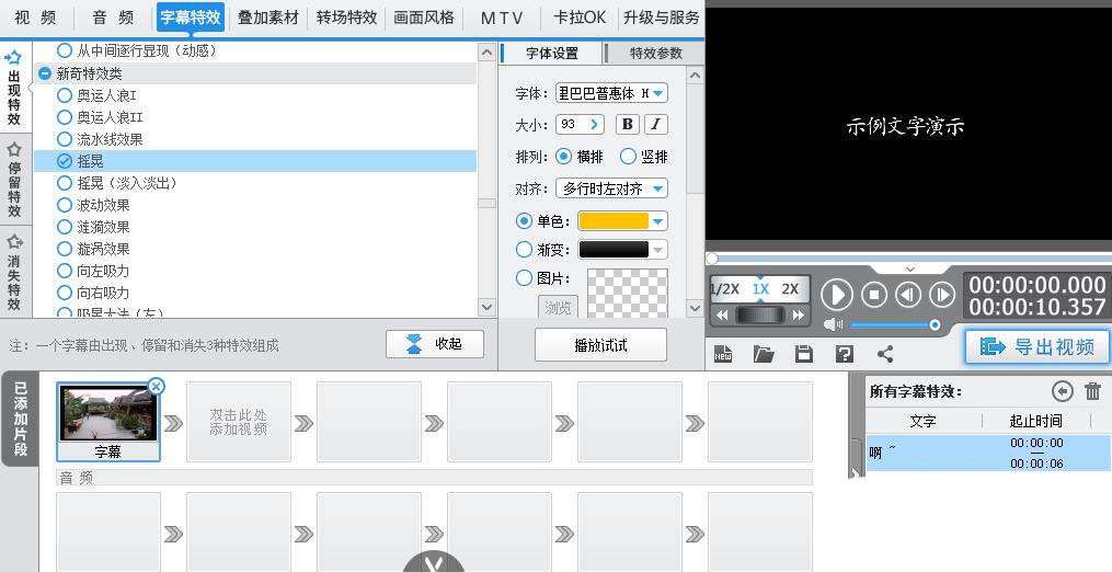 6、选择新奇类特效中的摇晃,会看到右侧视频界面有该特效的预览效果,点击播放试试,字幕的颤抖效果就加好了,快去试试吧。