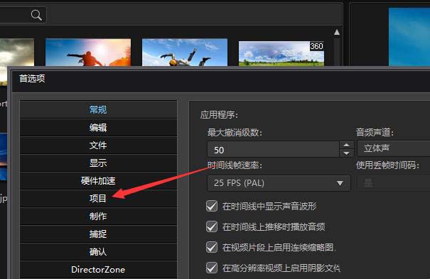 2、选择“项目”栏,选择“取消勾选威力导演打开时自动加载示例片段”选项
