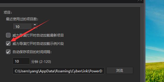 4、在项目栏中选择“取消勾选威力导演打开时自动加载示例片段”选项