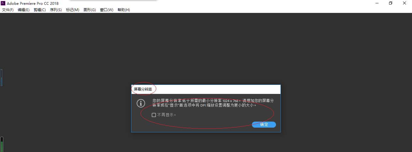 1、启动Adobe Premiere Pro CC 2018,点击"屏幕分辨率→确定"按钮。