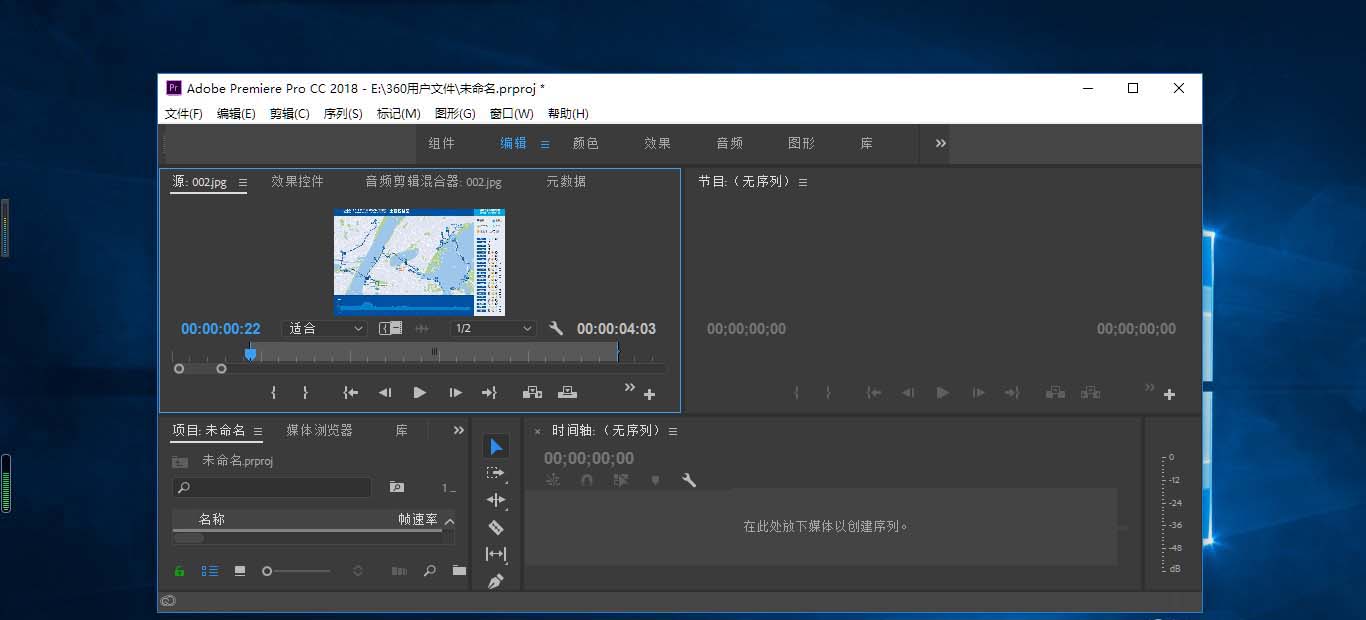 4、唤出Adobe Premiere Pro CC 2018主界面,鼠标左键选择"素材源面板"。