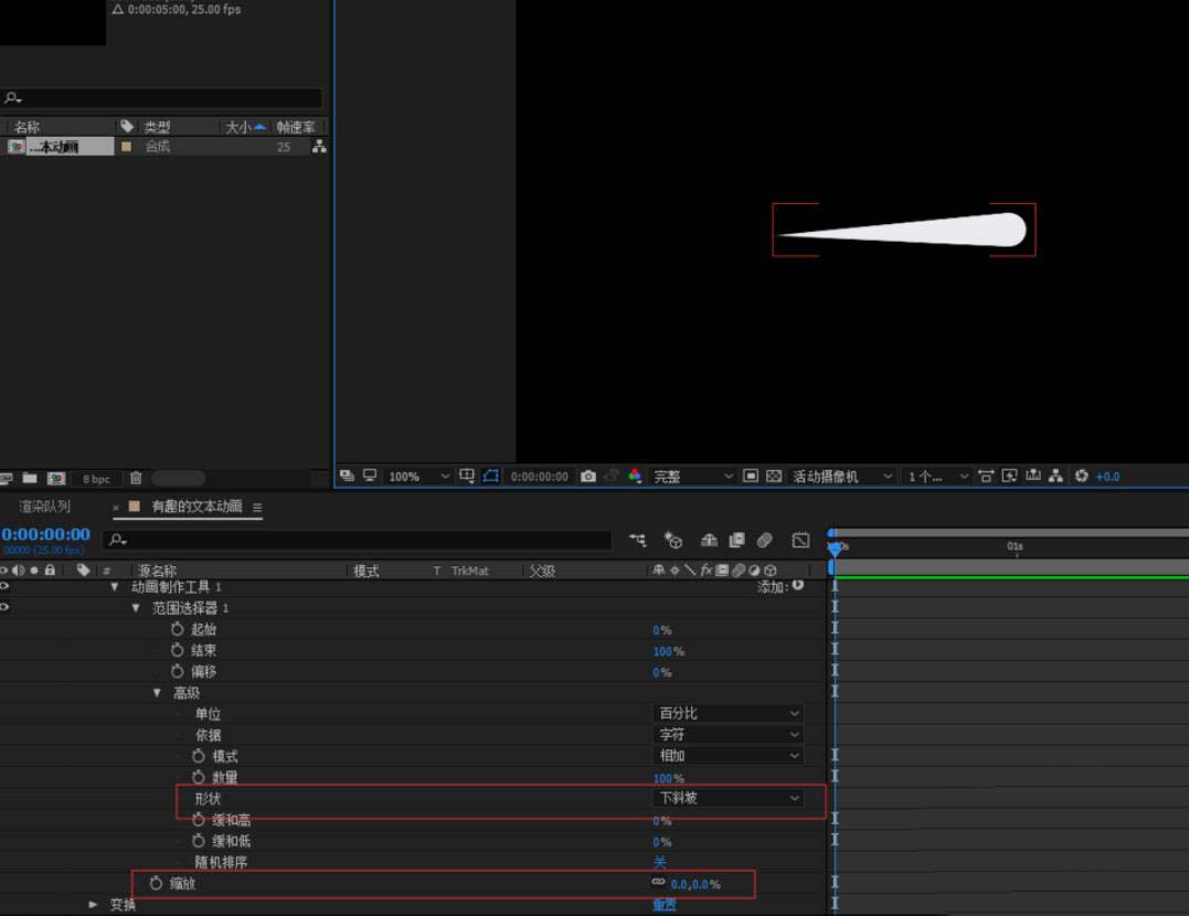 3、通过调整字符间距,形成点成线;然后动画那边添加缩放属性;将缩放数值调整为0;范围选择器里面的高级:把形状选择为下斜坡 这样直线变成了锥形;
