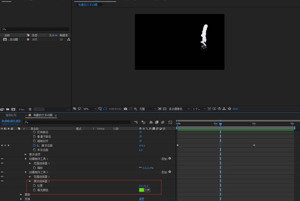 5、接下来我们还可以通过文本的一些参数进行调整细节,比如分组对齐,设置基线偏移等;再动画里添加位置属性,再添加摆动,改变位置参数, 范围选择器为下斜坡,继续添加填充颜色 rgb,填充颜色就可以实现一个颜色拖尾的动画了;