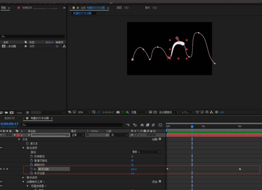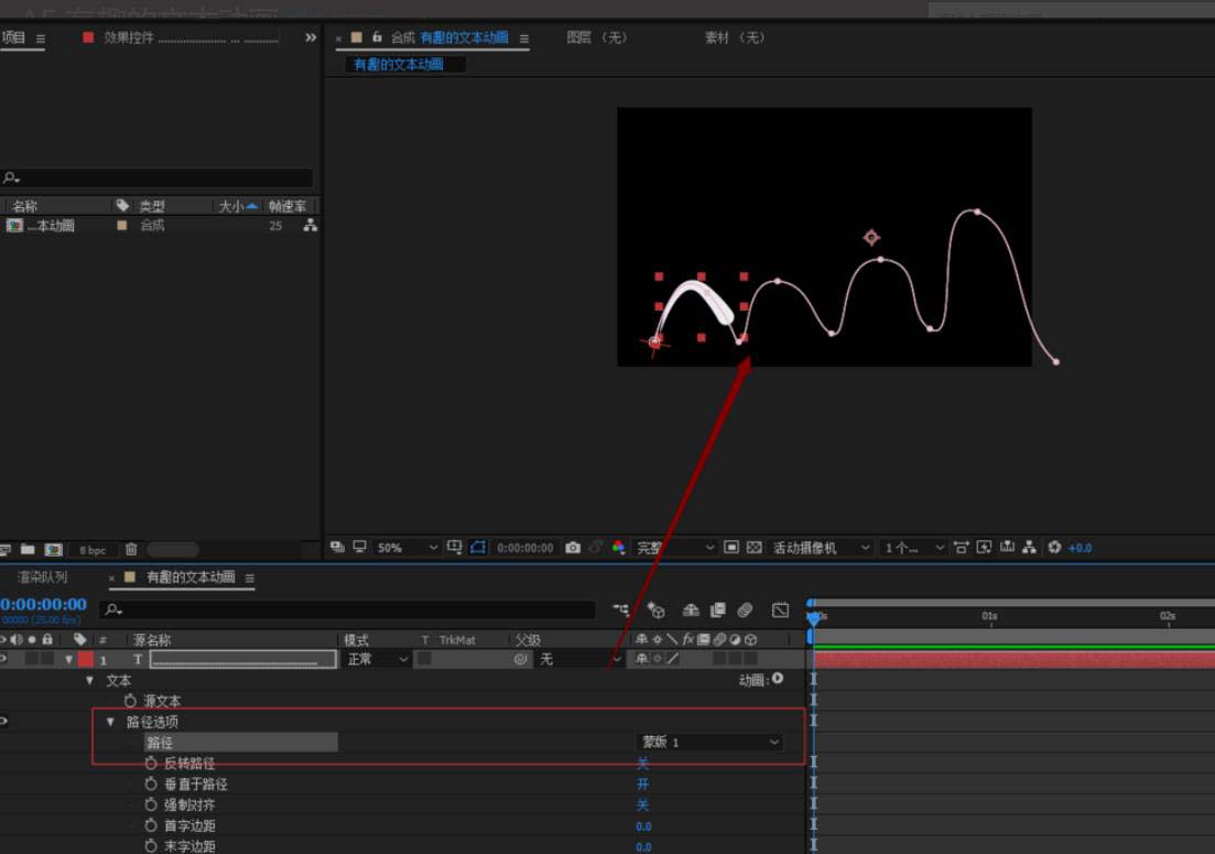 4、选中文本图层 选择钢笔工具绘制好路线,然后调整好的路径曲线,将文本的路径选成我们建立好的蒙版;通过调整首字边距k帧来实现动画;