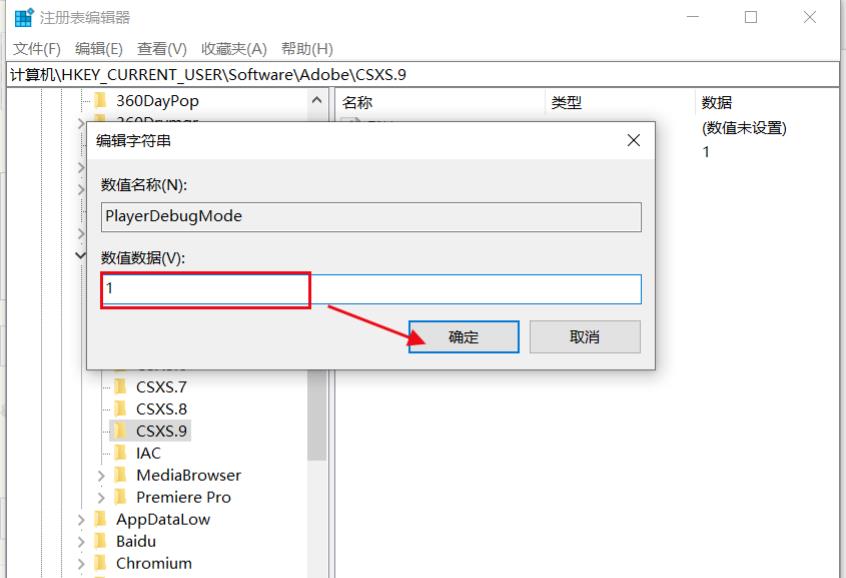 7、双击点开,填写数值:1,点击确定,关闭注册表。