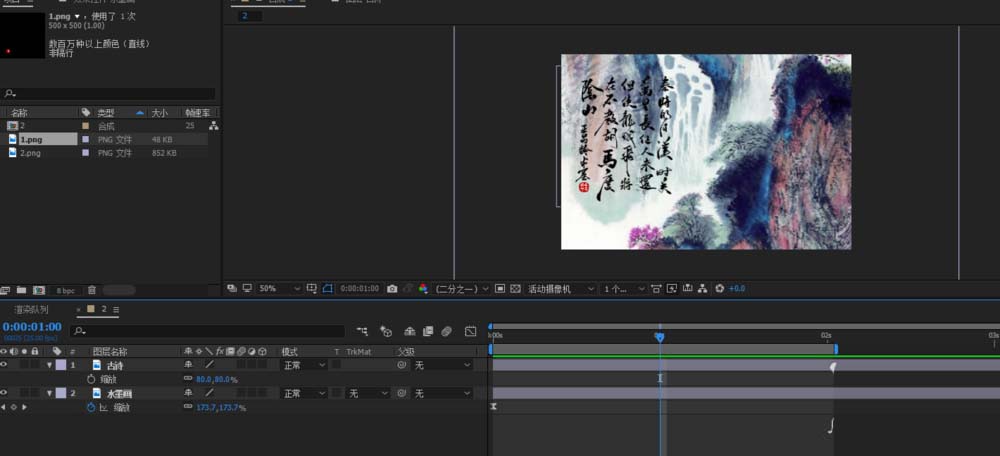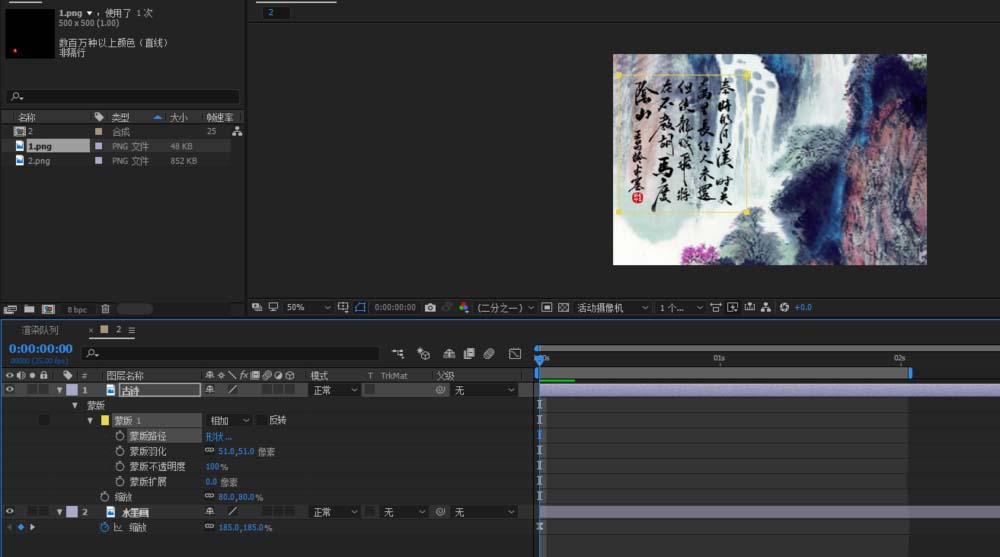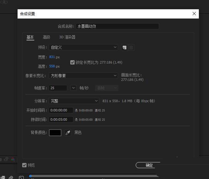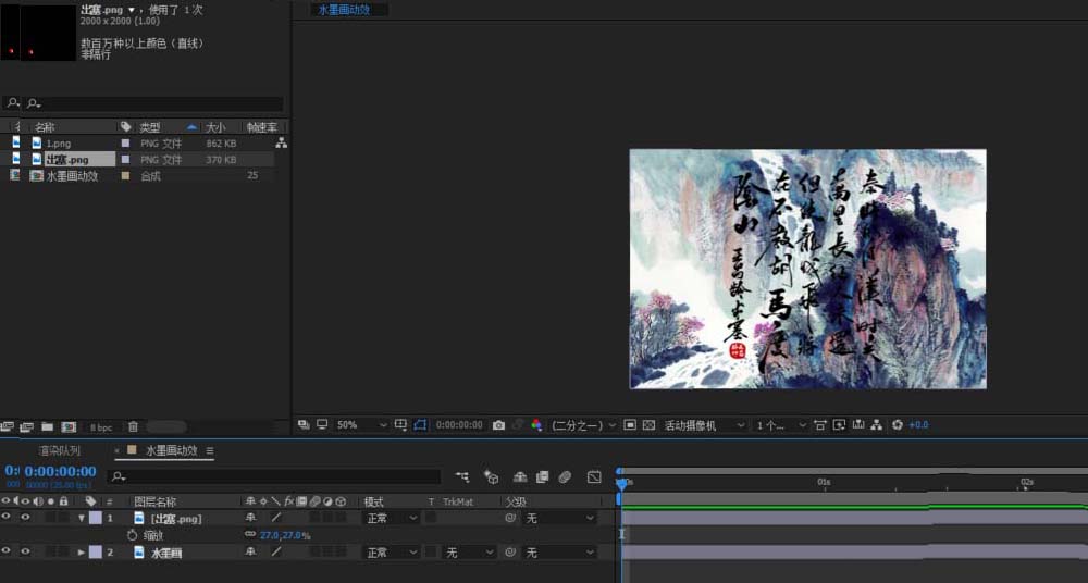1、打开AE软件,新建合成,命名水墨画动效,调整相应的参数。