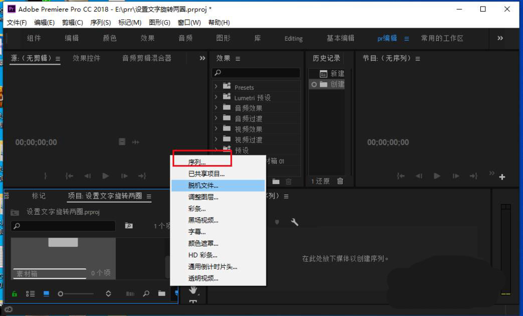2、点击新建图标,选择序列。