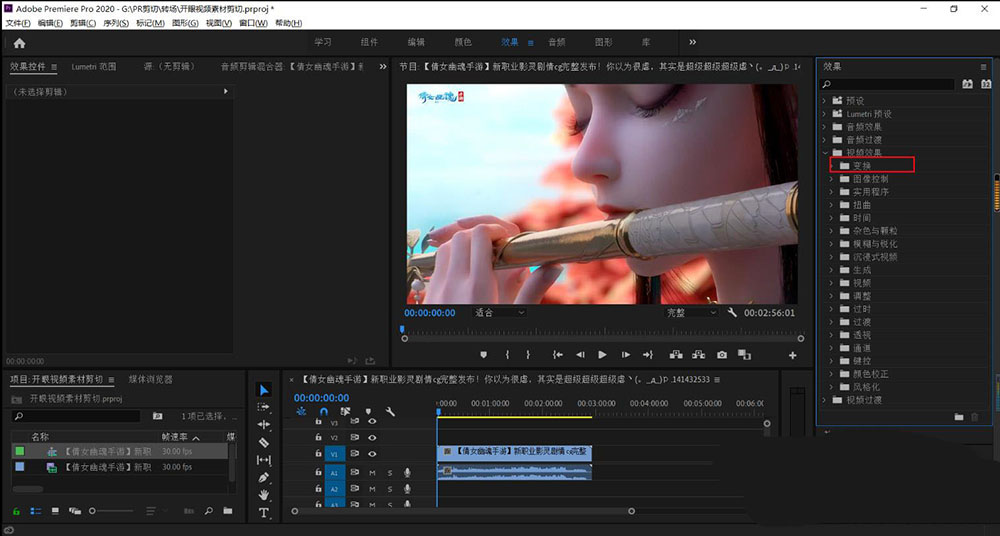 4、在视频效果里面找到【变换】并打开。