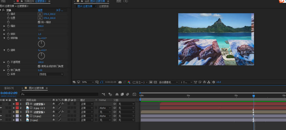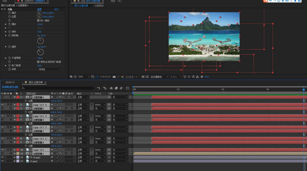 3、选中过渡蒙版层和图片2,ctrl+d复制,这将是我们主要的蒙版路径,所以我们可以把它设置为红色,这样方便我们的快速识别他;然后将他们大概往后拖拉大概10-15帧,这样我们就有两个过渡蒙版路径了,选择过渡蒙版1,添加变换,设置数值,然后把变换复制给图片2(2),设置缩放和倾斜值;