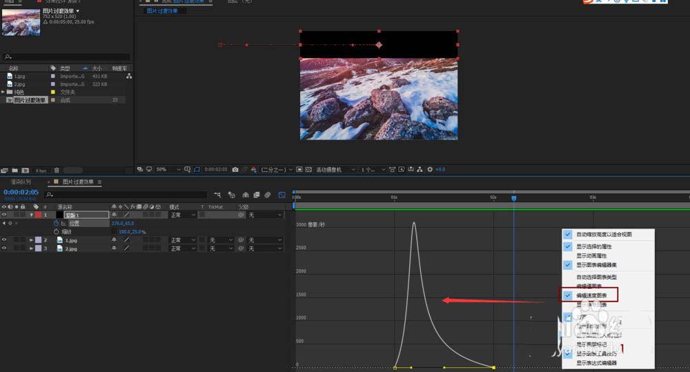 4、在第二秒也就是第二张图片素材开始播放的时候,选择蒙版1,在第二秒处给位置k下关键帧,在往前1秒k下关键帧将蒙版1移出左边画布外,然后选中两个关键帧,按下f9给关键帧来一个缓动,进入曲线编辑器,编辑速度曲线,而不是数值曲线,然后拖拉曲线,往右一点,这样一来就有了一个线快后面的速度节奏;