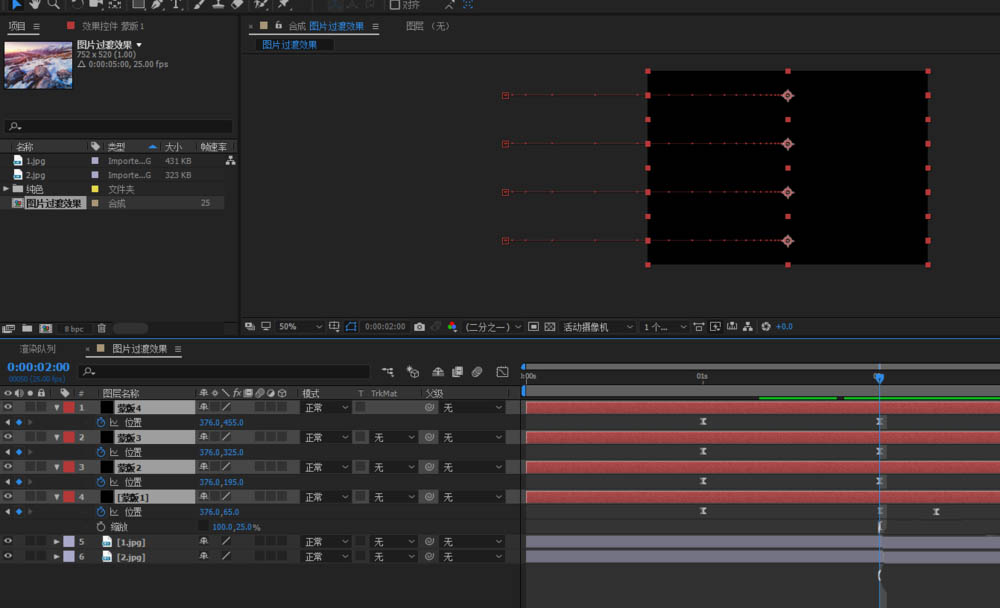 5、回到两秒处,选择蒙版1,ctrl+d复制纯色层,命名为蒙版2,选中蒙版2按下u键,调用出所有关键帧,选中所有关键帧,将蒙版2往下移动,将他和蒙版1进行上下拼接,同理复制得到蒙版3,同理操作将其和蒙版2进行上下的拼接;这样三个纯色层蒙版就把整个画布进行了无缝覆盖了,这样基本有了一个幻灯片切换的效果了;蒙版4同理操作;