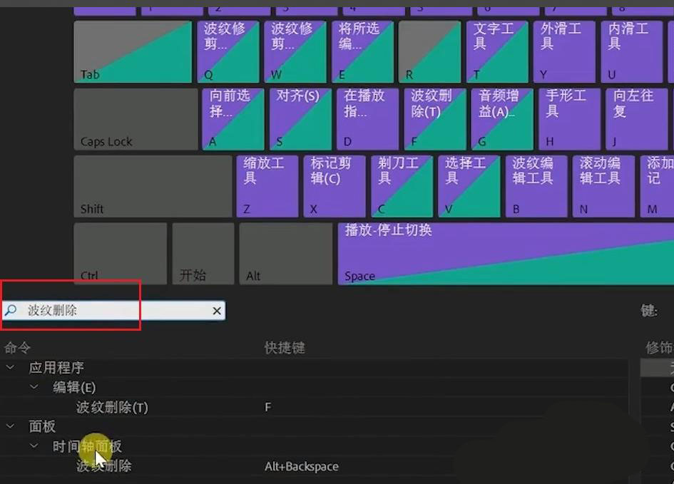 以前的时候如果我们想要删除视频中间的一段素材。那么我们需要先按delete除素材。然后再右键删除空隙。这样的话。如果剪辑的时间短。并不会觉得麻烦,但是如果你剪辑的时间很长,你就会觉得很浪费时间,我们可以通过快捷键F一步到位。但是这个快捷键不是系统默认的快捷键。所以我们需要自己手动设置一下。首先我们在PR的菜单栏中选择-编辑。然后选择-快捷键。在搜索框中输入-波纹删除。然后我们就可以看到波纹删除。你可以根据你自己的喜好来设置默认的快捷键。