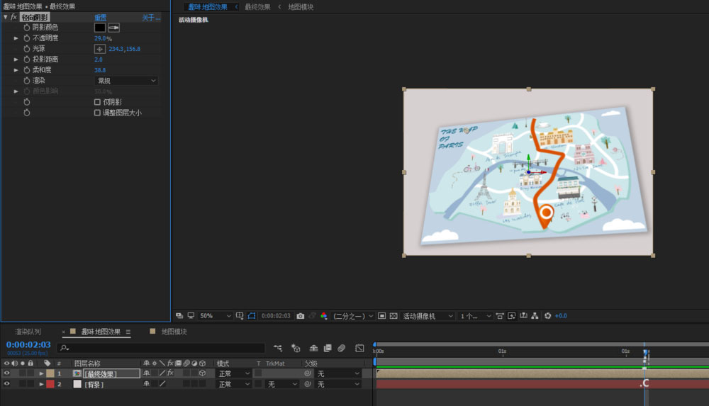 8、ctrl+y创建一个纯色层,命名为背景,给最终效果预合成添加径向阴影,修改距离,方向以及地图的阴影的柔和度;