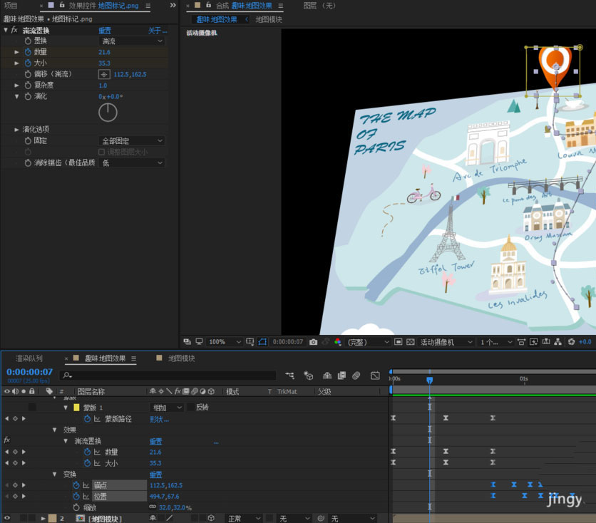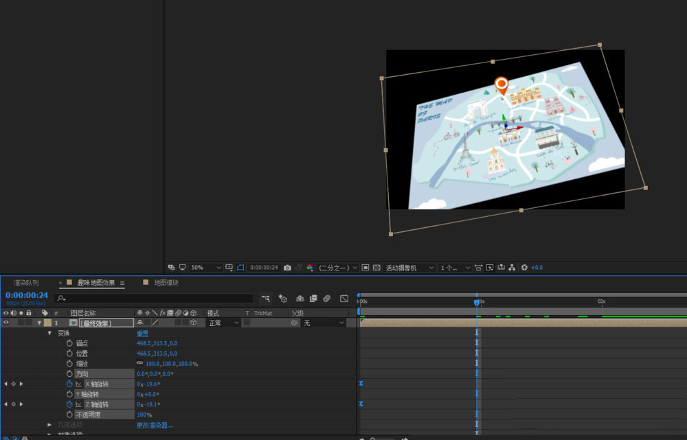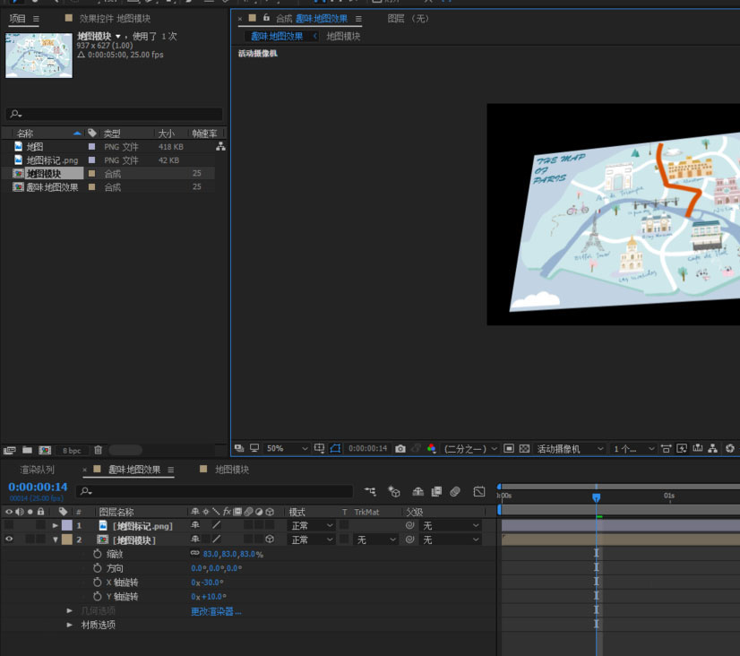 4、选中路径和地图ctrl+shift+c预合成,命名为地图模块;打开预合成的3D模式,将地图的大小缩小,更改x轴旋转,y轴旋转;