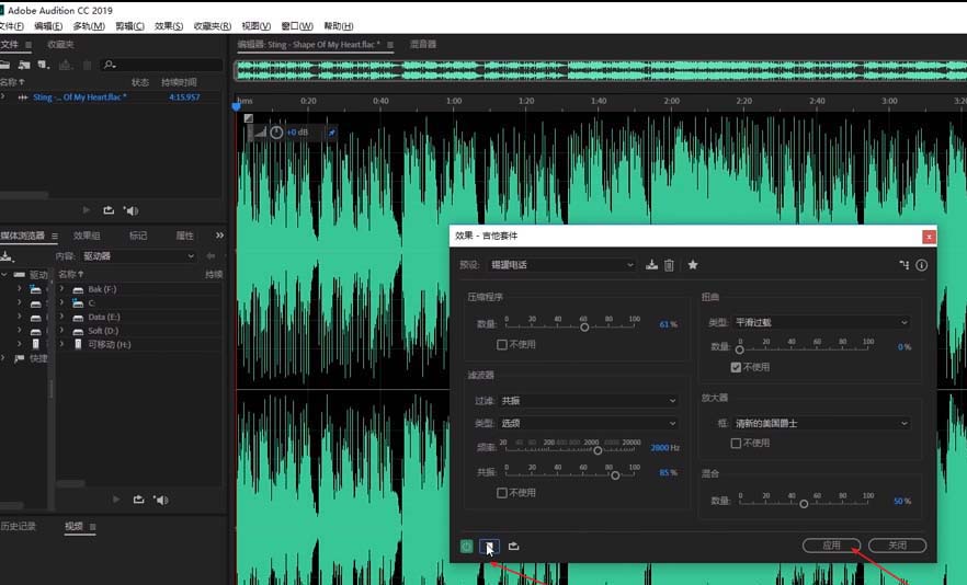 4、点击“效果-特殊效果-吉他套件”。点击“锡罐电话”预设。点击应用并试听效果。