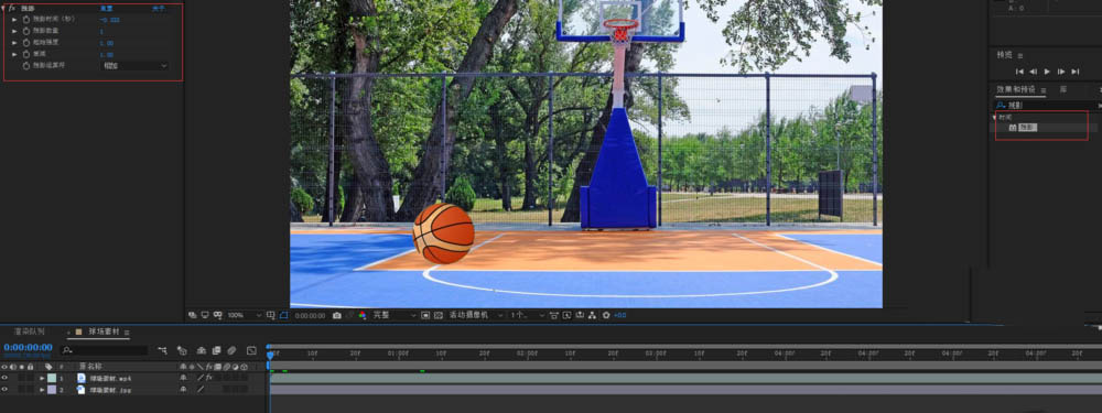4、效果和预设面板——输入残影——将残影效果拖入篮球素材中