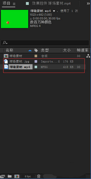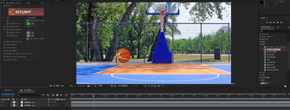 3、点击篮球素材——效果和预设面板——抠像——keylight——吸管——吸篮球素材绿色位置