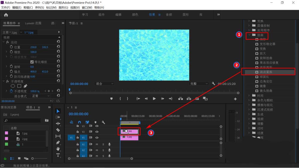 3、鼠标点击右侧的视频效果,依次打开“扭曲”,“湍流置换”后鼠标点击“湍流置换”并把它拖入时间轴上层的海水图片上。