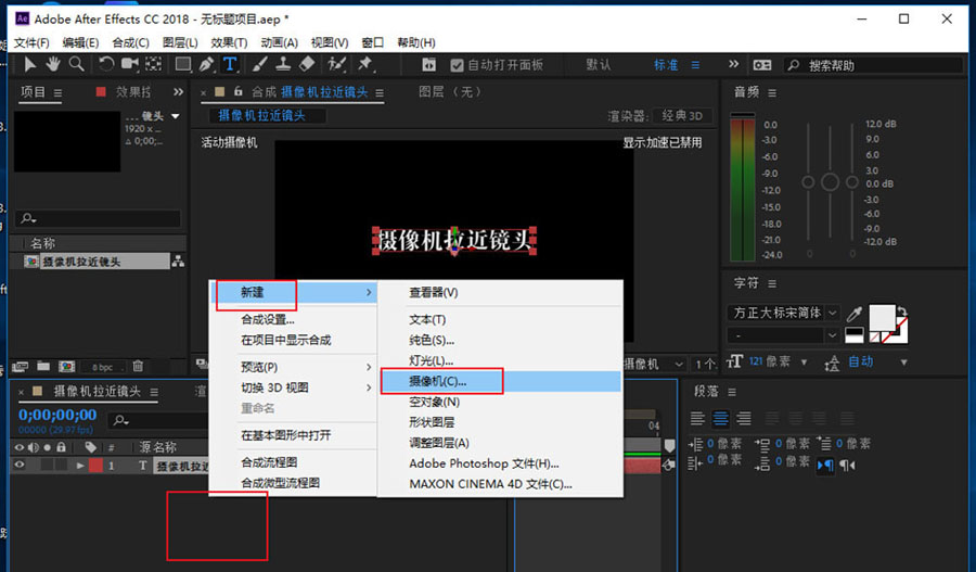 4、在图层面板空白区域右击,选择【新建】-【摄像机】。