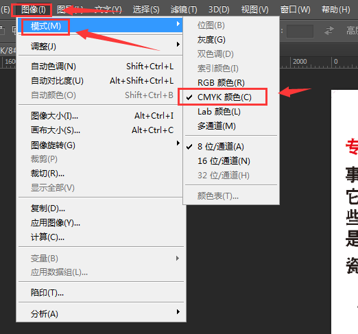 4、打开文件后,点击PS软件上方的“图像-模式”,此时可以看到刚打开的图片是CMYK模式。