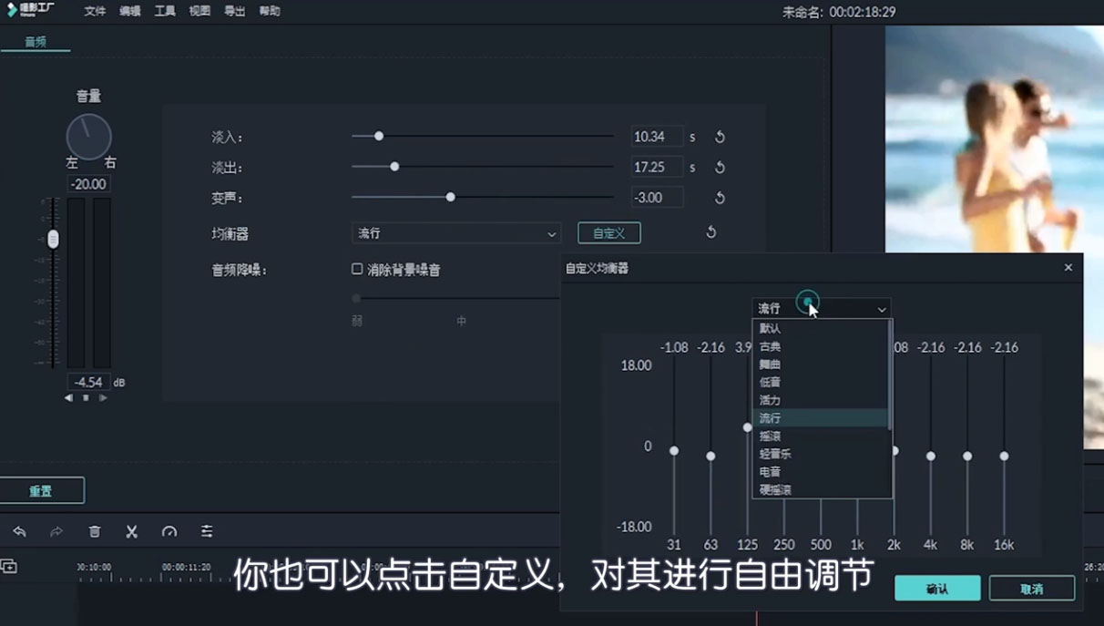 5、可按住“Alt+鼠标点击”添加关键帧,点击即可删除,还可以点击“自定义”对音频属性进行调节。