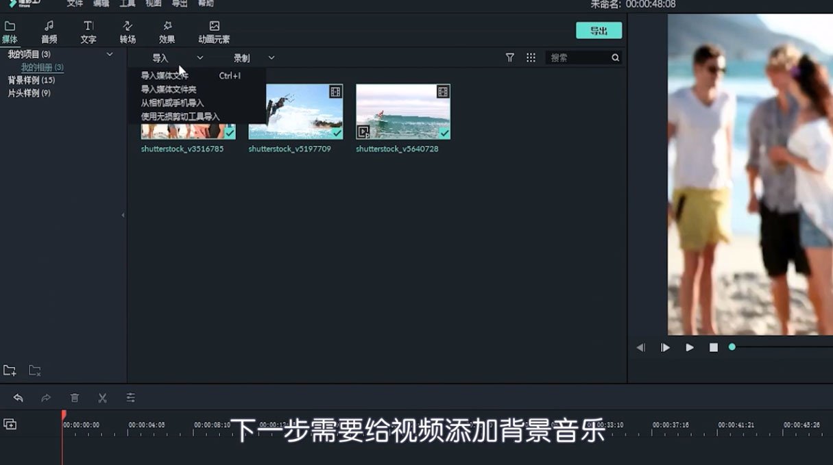 2、点击“导入”选择“导入媒体文件夹”,从电脑中导入自己的背景音乐。
