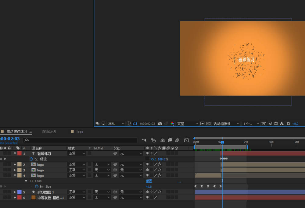 5、ctrl+t输入logo破碎之后的文本内容:破碎练习;把这个图层放在破碎开始的地方,按下s键打开缩放属性,把缩放属性前的等比例去掉,单独给文字的宽度K关键帧,实现破碎之后文字展现的一个效果;