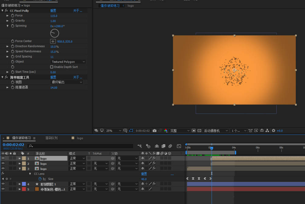 4、选中logo预合成ctrl+shift+d将预合成剪切成两段,将剪切得来的新的预合成的起始值进行调整(如果不调整的话添加了破碎效果会不起作用);添加CC pixel polly 破碎效果;添加简单阻塞工具,让碎片更圆润化,可以把碎片预合成复制一层,调整参数,进一步优化碎片;