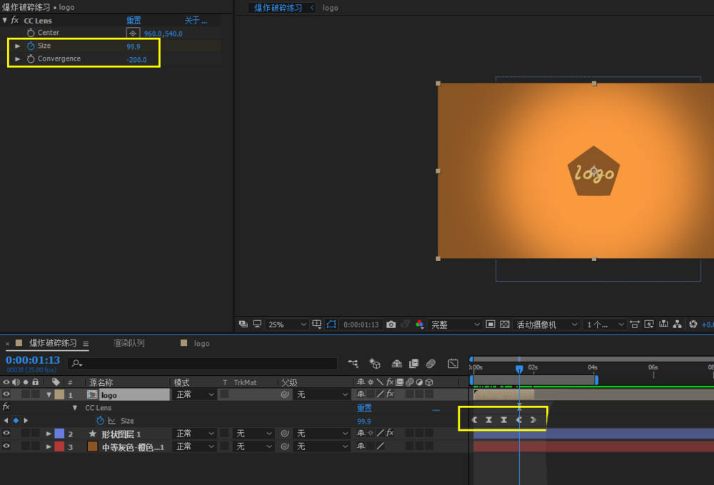 3、ctrl+t输入logo文本,再添加一个多边形,ctrl+shift+c预合成命名为logo,选中logo预合成,添加CC Lens透镜效果,调整Convergence的数值,给Size属性k关键帧实现一个大小弹性动画;