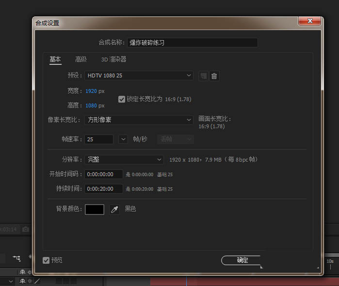 1、打开AE软件,命名爆炸破碎练习,调整相应的参数。