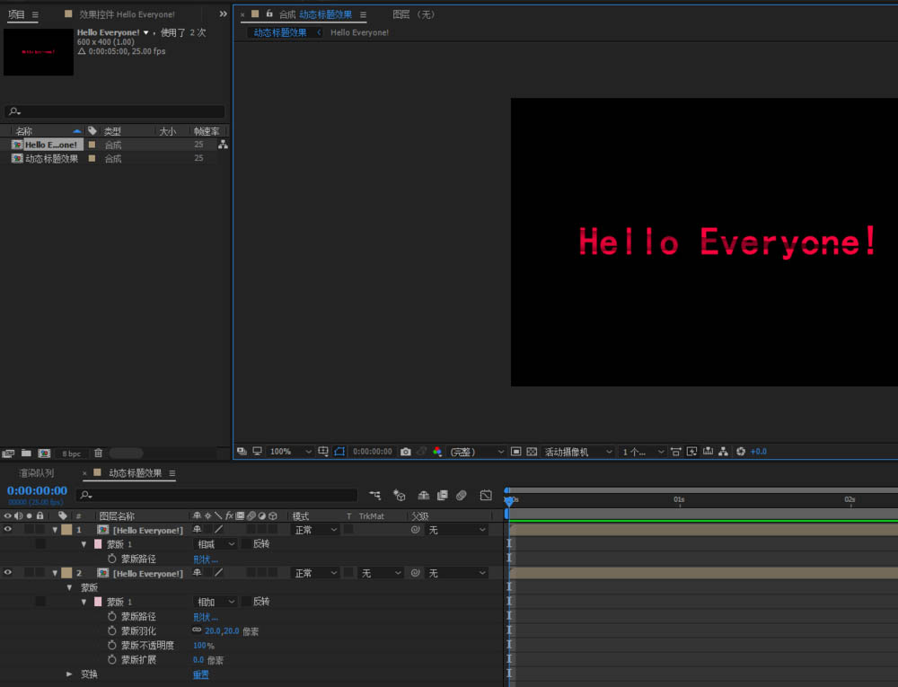 4、选中文本预合成,ctrl+d复制一层文本预合成,选中上层文本预合成按下M键打开蒙版选项,将蒙版模式选择为相减;同样操作,选中下层预合成按下M键打开蒙版选项,将遮罩羽化修改为20px;