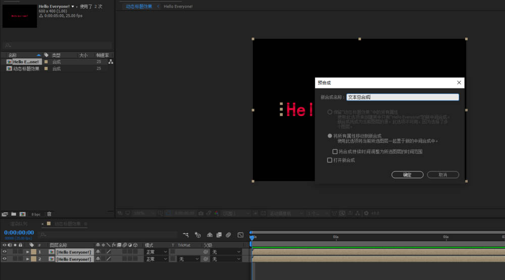 5、选中两个文本预合成,ctrl+shift+c预合成,命名为文本总合成;