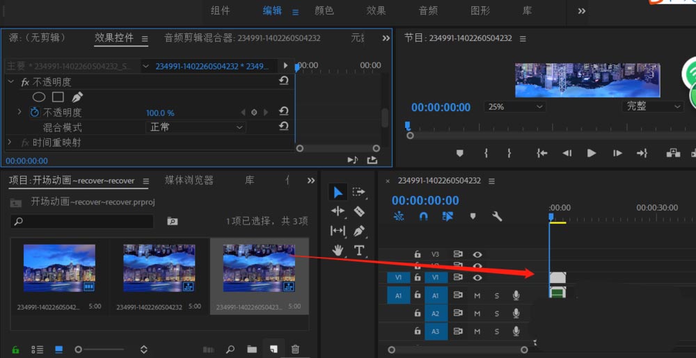 4、选中两个轨道素材右键“制作子序列”接着将子序列拖至到时间序列中,然后即可根据需要添加动画即可