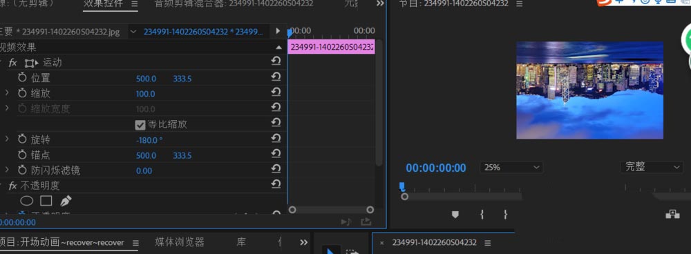 2、选中复制好的素材轨道,在效果控件中找到“位置-旋转”旋转倒置一下素材,并调整好位置